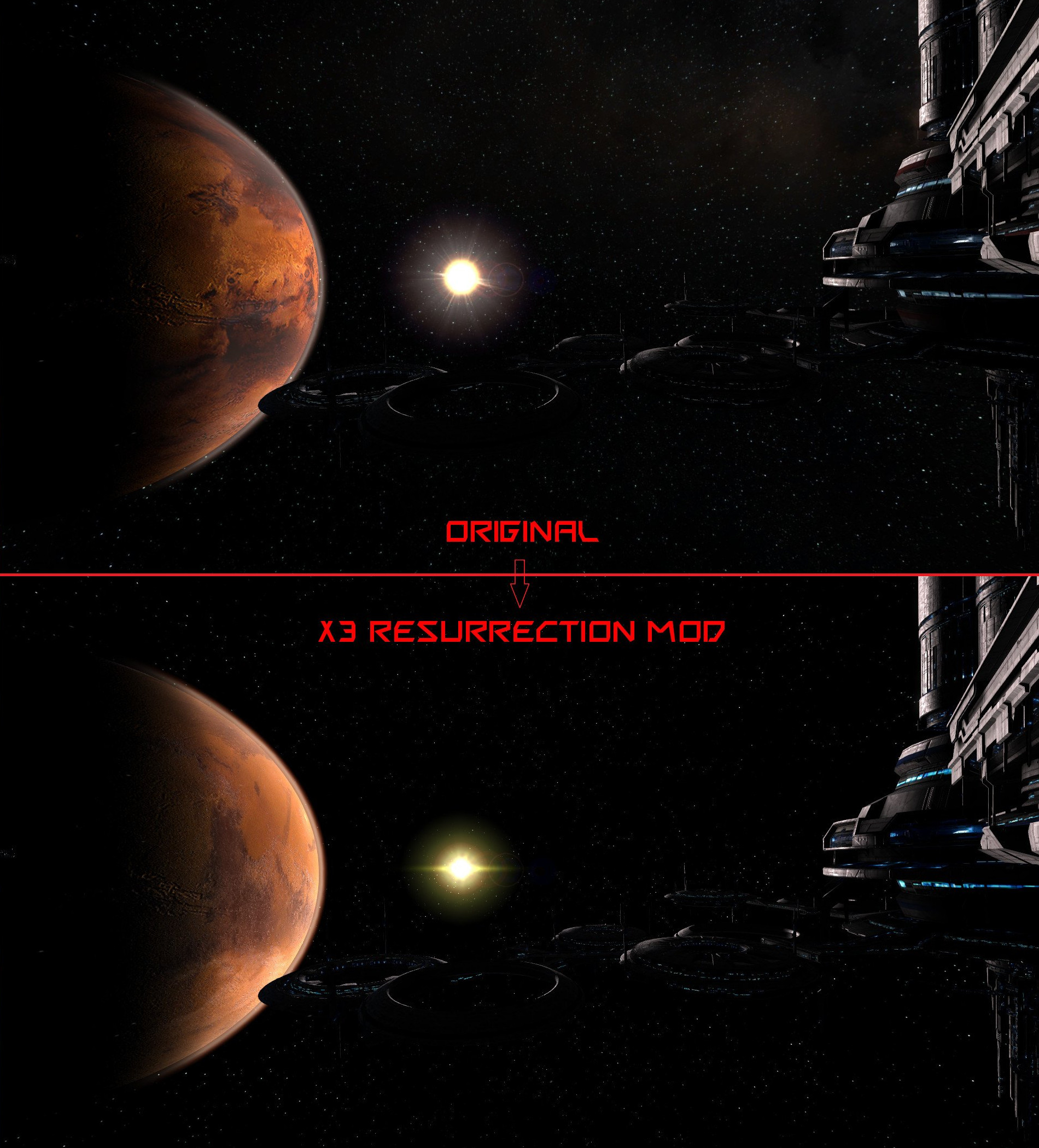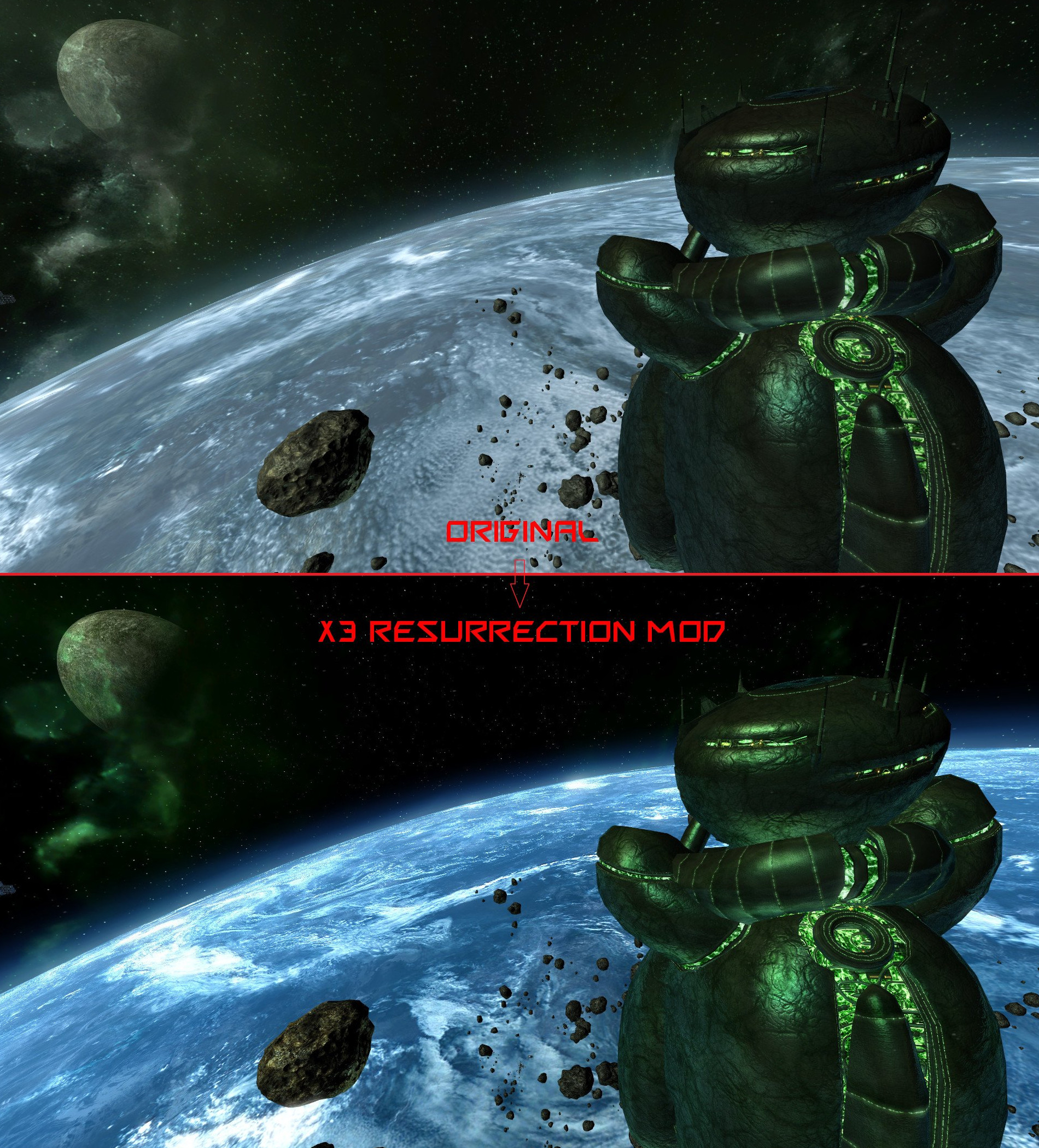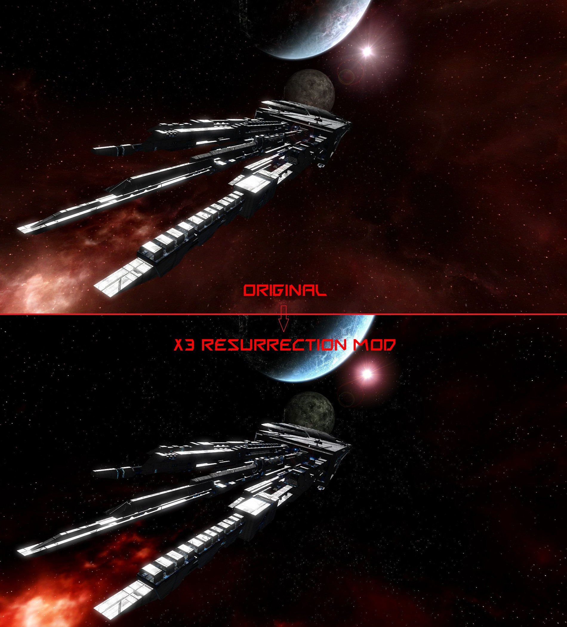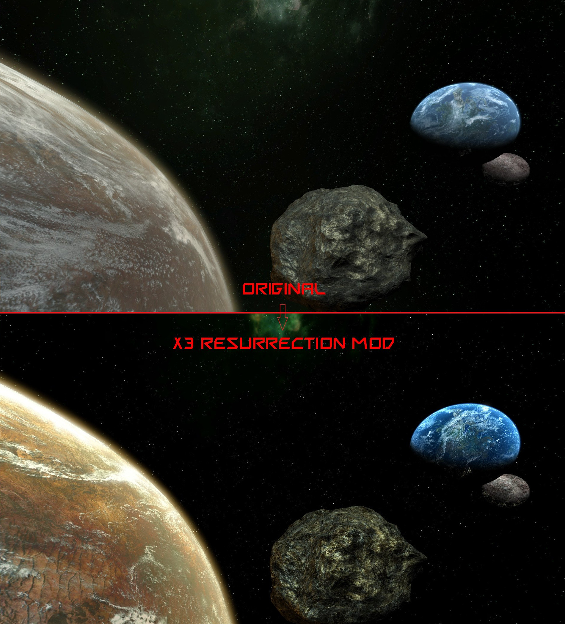 This page is focused on my mod X3 - Resurrection. This is a mod that improves the graphical environment of this game by modifying the original ones and adding my own textures. I tried to breathe some life and color into the game. even after the first launch, you will notice as if a kind of gray veil has disappeared from the game. The stars are not yellow-white spots, but they really seem to shine, planets, asteroids, ship textures, everything is much more expressive, sharper, more colorful. In the original, the game never looked too realistic in terms of graphics, so I didn't try to make it too realistic even in my mode. Rather, I highlighted what was already beautiful, but under the gray and blurred veil.